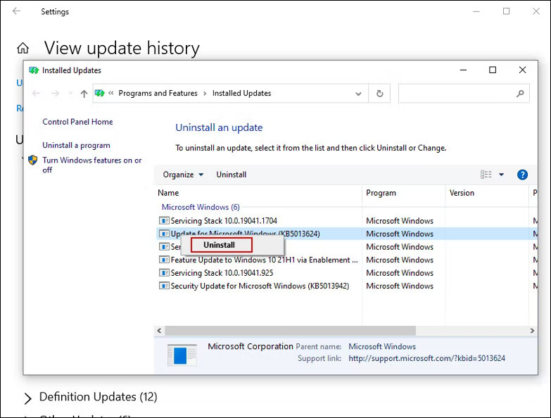 - 在以下窗口中,从左侧面板中选择 Windows 更新,然后单击右侧的查看已安装更新历史记录。